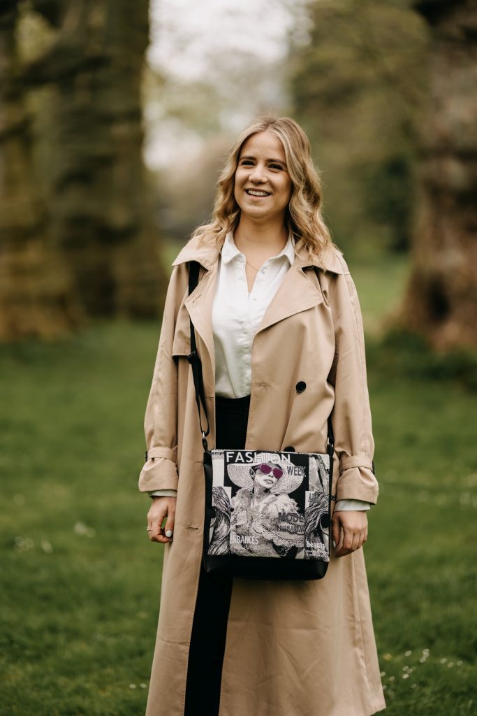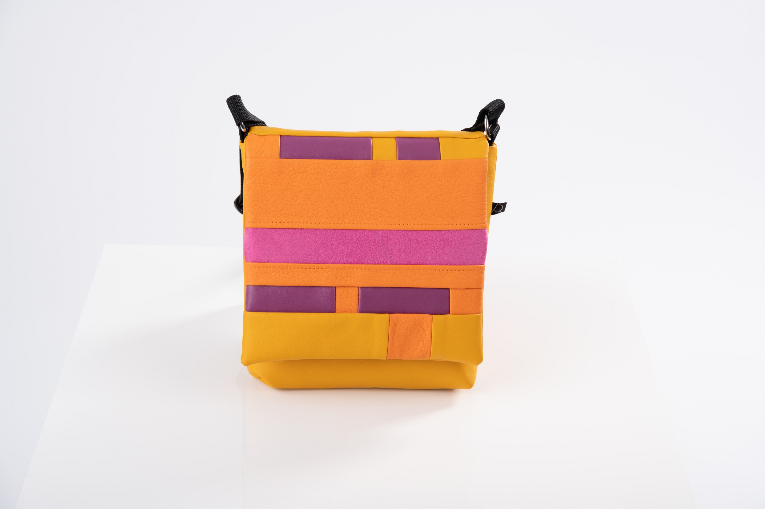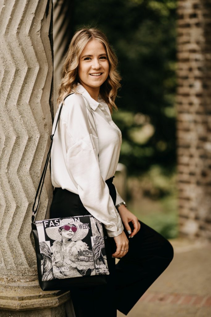 Der Tragegurt ist individuell verstellbar. Die Tasche, die in den verschiedensten Farbkombinationen und Designs erhältlich ist, kann auch alternativ in unterschiedlichen Größen und mit Reißverschluss-Innentasche oder mit Taschenmagnetverschluss angefertigt werden.
